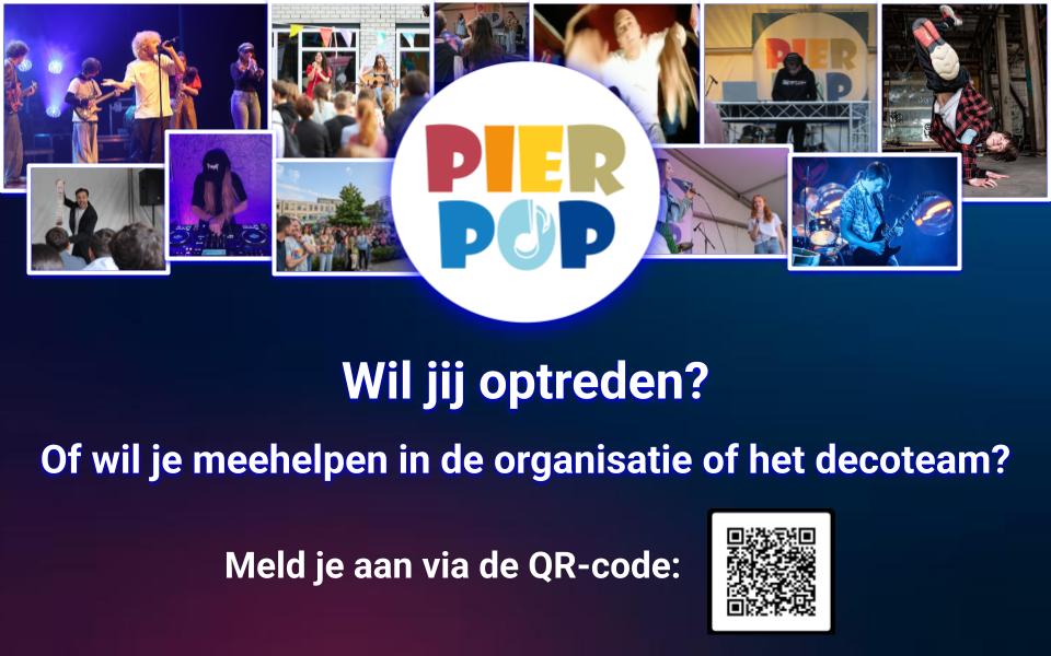 Maak jij muziek, alleen of met mensen samen? Pak jij het podium als dj, dansact of heb je een ander leuk idee? Of lijkt het je leuk om te helpen in de organisatie van het festival? Leerlingen en medewerkers mogen optreden op Pierpop of helpen in de crew! Mail mw. Vreeswijk voor meer informatie.
