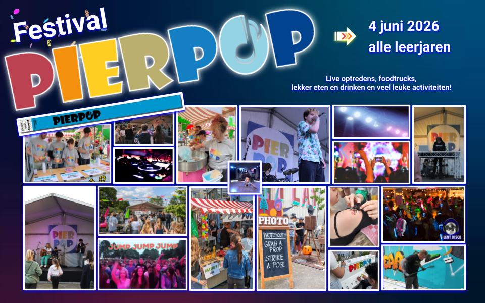 Lekker in het zonnetje met een drankje in je hand genieten van mooie muziek, gemaakt door onze eigen leerlingen en oud-leerlingen. Op de foto met je klasgenoten of meedoen aan het maken van een groot kunstwerk. Een glittertattoo halen of iets lekkers halen bij een van de foodtrucks. Dat kan allemaal tijdens Festival Pierpop!